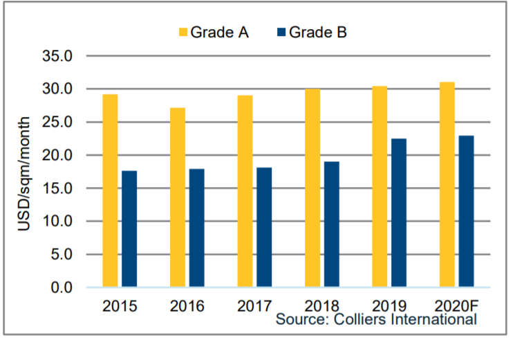 Theo đó, trong quý 2/2020, thị trường văn phòng tại Hà Nội không ghi nhận nguồn cung mới, nhu cầu thuê văn phòng cũng sụt giảm. Đồng thời, tỉ lệ lấp đầy trung bình ở các tòa nhà hạng A và hạng B đều giảm 3-4% so với quý trước.