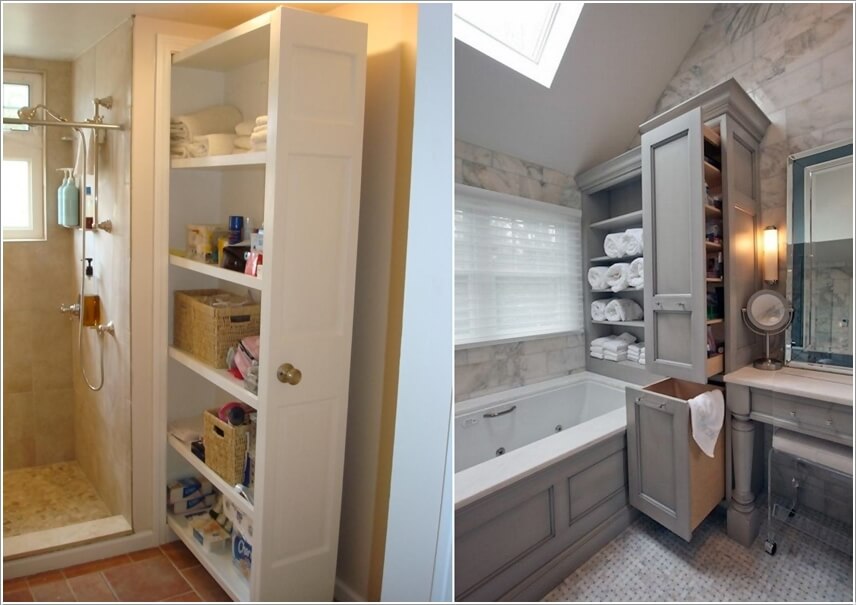 Tận dụng không gian dọc theo chiều cao của vòi sen hoặc phía trên bồn tắm để làm nơi lưu trữ đồ dùng, khăn tắm,..