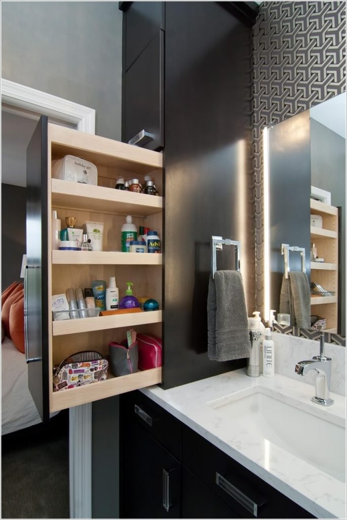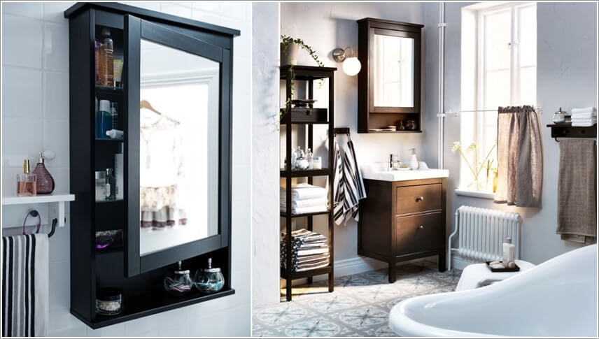 Một chiếc tủ đựng mỹ phẩm, vật dụng làm tóc, thuốc thường dùng trong nhà và gắn gương bên ngoài là một gợi ý không tồi cho phòng tắm cho diện tích nhỏ.
