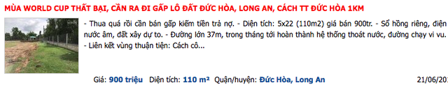 “Vì tin vào đội Đức nên giờ em cần bán gấp lô đất ở huyện Củ Chi, diện tích 100m2, giá 1 tỷ 50 triệu đồng”, thông tin được đăng tải kèm với đó là hình ảnh sổ đỏ và vị trí khu đất. Với mức giá này, nhiều người cho rằng khá hấp dẫn, cũng không ít người tỏ ra cảnh giác với các thông tin trên vì sợ bị “hớ”.