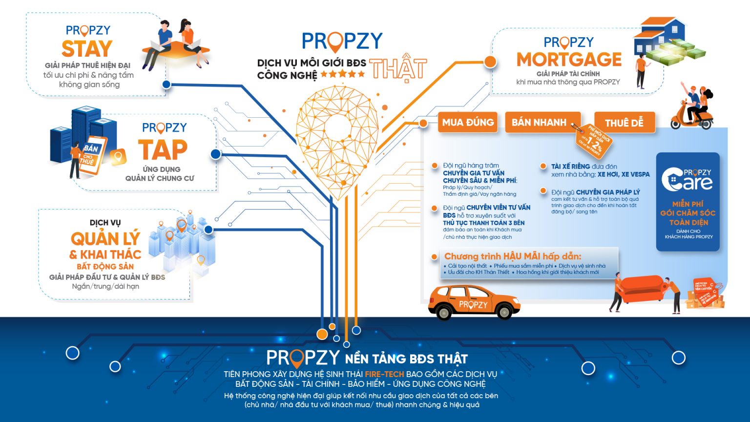 Propzy đã cho phát triển và số hóa một hệ sinh thái cho toàn bộ vòng đời của một bất động sản, từ các hoạt động mua bán, cho thuê đến hoạt động quản lý. Với tiêu chí MINH BẠCH trong mọi bước giao dịch, nền tảng này đã thay thế giao dịch bất động sản truyền thống, khi mà các công ty môi giới là cầu nối duy nhất kết nối các nhà phát triển bất động sản và người mua. Nền tảng toàn diện của Propzy đã cung cấp cho khách hàng toàn bộ dữ liệu định giá để giúp những người chưa có kinh nghiệm tránh bị nhầm lẫn từ các đại lý không có giấy phép hợp pháp cũng như sự phức tạp của thị trường bất động sản đang bùng nổ ở thị trường Việt Nam.