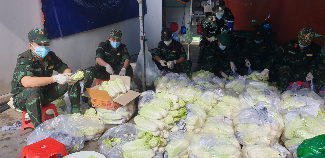 Lực lượng quân đội đang phân chia rau, củ thành từng phần để trao đến các hộ dân