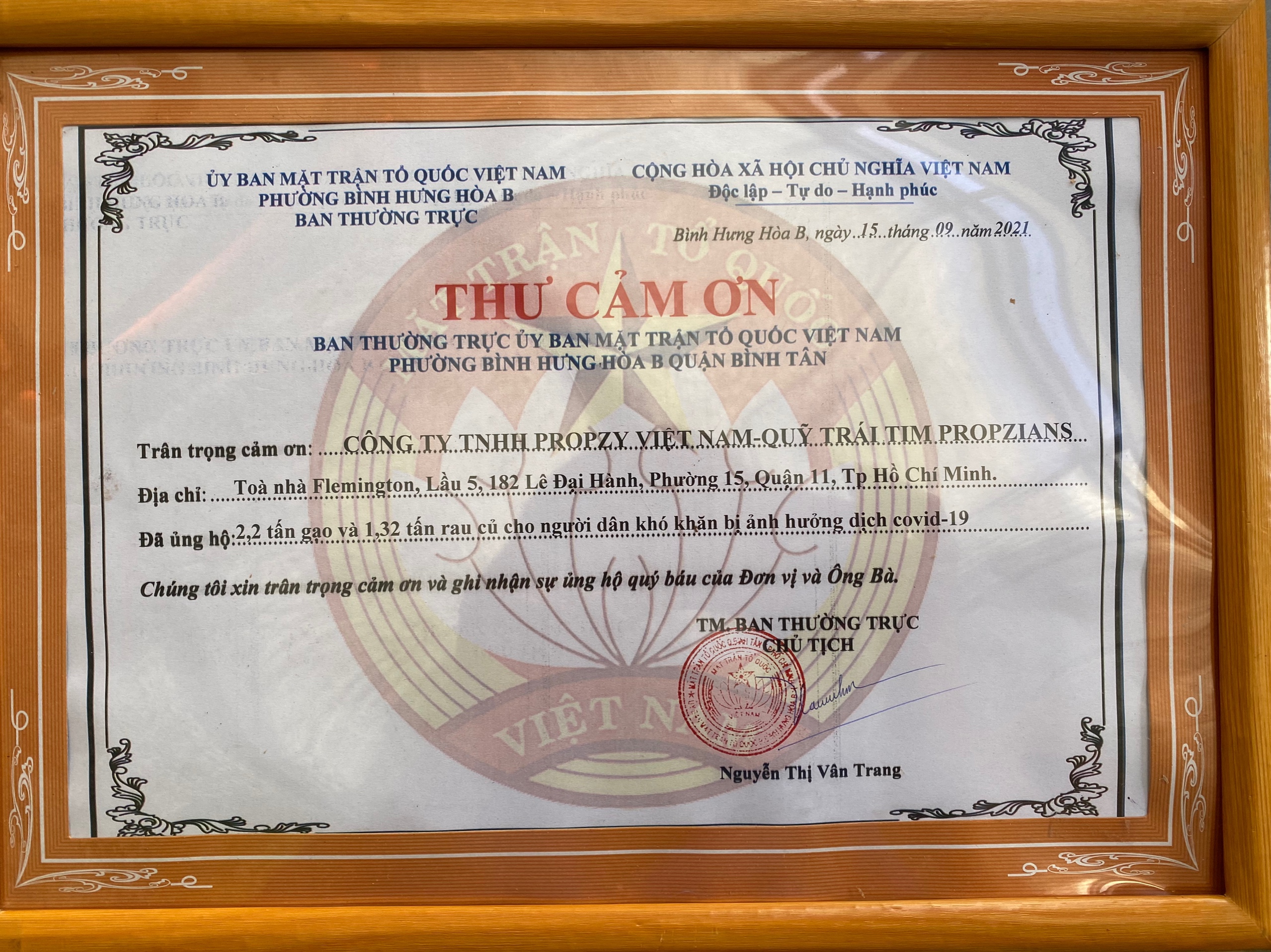 Ghi nhận tấm lòng của toàn thể đội ngũ lãnh đạo, nhân viên Propzy trong thời điểm khó khăn của dịch bệnh Covid-19, Uỷ ban Mặt trận Tổ quốc Việt Nam phường Bình Hưng Hòa B đã gửi THƯ CẢM ƠN đến Công ty TNHH Propzy Việt Nam – Qũy Trái tim Propzians.