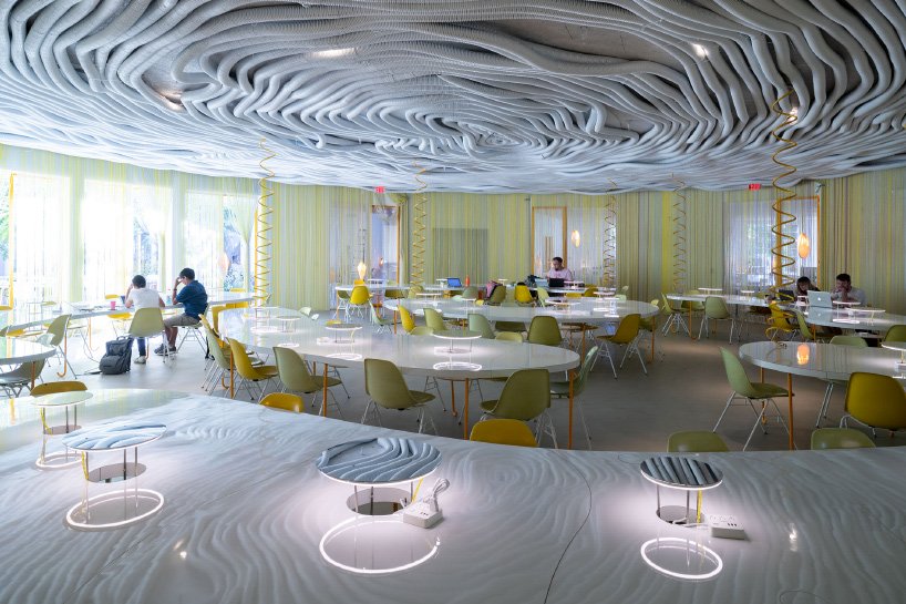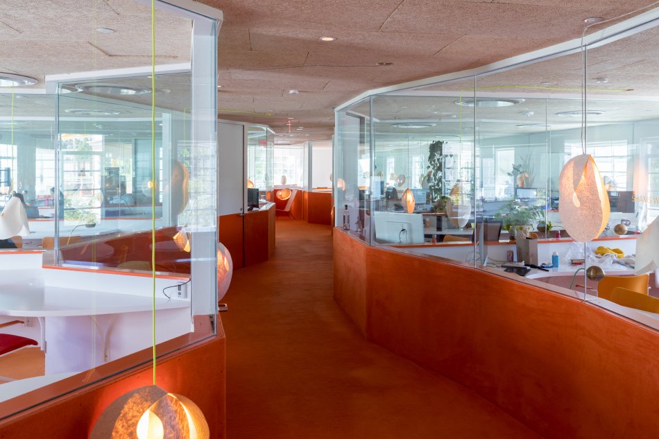 Nhóm thiết kế đã tạo ra các gian phòng hình bầu dục với kích cỡ và chu vi khác nhau nằm rải rác giữa khu vườn được định sẵn. Toàn bộ phần tường chắn của 60 khối văn phòng đều được bao bằng kính trong suốt, cung cấp tầm nhìn thoáng đãng ra mảng xanh che phủ khắp nơi. Giải pháp thiết kế này giúp người sử dụng bên trong như được che phủ, hoà mình giữa quan cảnh tự nhiên, tách biệt khỏi nhịp sống đô thị đang diễn ra xung quanh. Khu vực toà nhà cũ được giữ lại giờ đây được chuyển thành lối vào chính cho toàn bộ khuôn viên. Tổng thể khối văn phòng bao gồm 320 nơi làm việc linh động tại tầng trệt, 200 không gian làm việc chuyên dụng ở lầu 1 và các không gian chung như quán cafe, quán bar, nhà hàng, phòng tổ chức sự kiện và sân thượng nằm rải rác.
