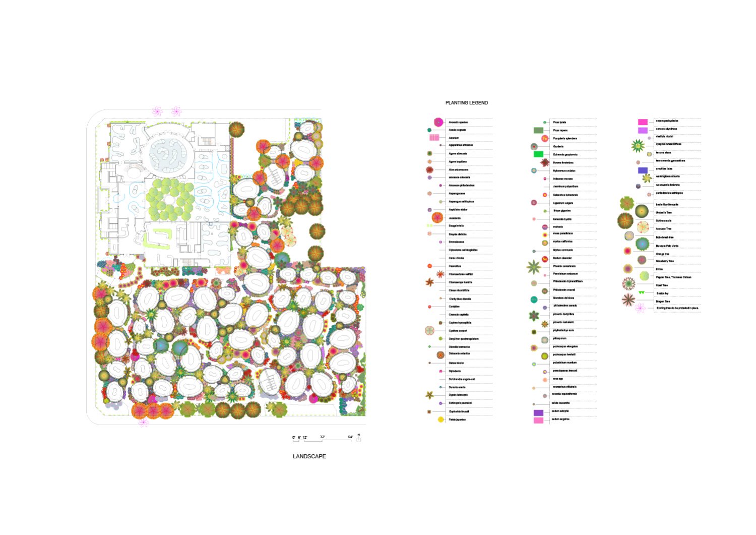 Các KTS thiết kế cho biết rằng trọng tâm thiết kế của toàn bộ dự án thực chất nằm ở khu vực ngoài trời, toàn bộ không gian bên trong đều sẽ hướng về các khu vực này. Thay vì đưa không gian vườn vào bên trong khu làm việc, nhóm thiết kế quyết định đặt toàn bộ ở bên ngoài, cũng vì vậy mà có thể xem đây là giải pháp mang nơi chốn làm việc ra bên ngoài những giới hạn được định sẵn. Tương ứng với 60 khối văn phòng là một mạng lưới giao thông được bố trí để kết nối toàn bộ các cụm làm việc lại với nhau. Toàn bộ khoảng vườn bao gồm 10,000 cá thể cây, tất cả đều được đảm bảo phát triển tươi tốt nhờ khí hậu ôn hoà tại Los Angeles.