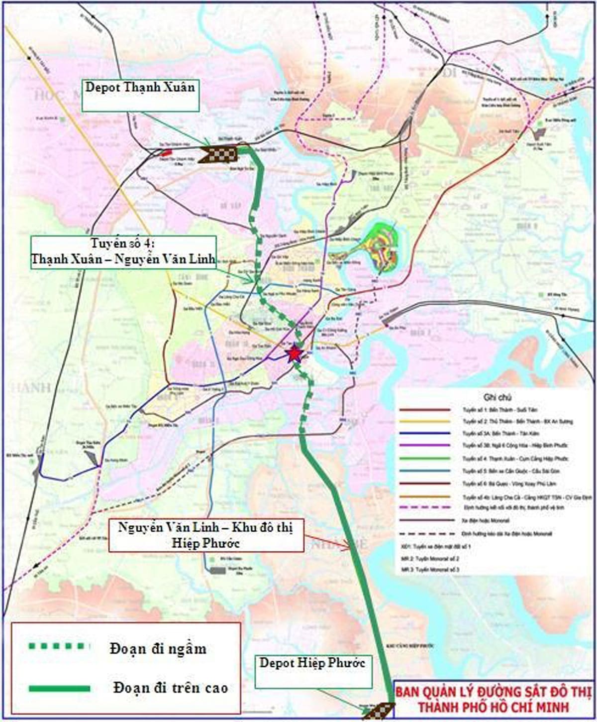 - Tuyến Metro số 4 kết nối từ Thạnh Xuân, quận 12 đến Hiệp Phước, huyện Nhà Bè.