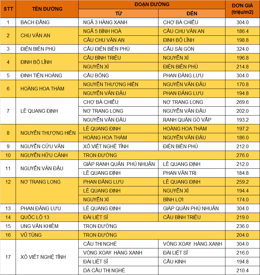 Bốn tuyến đường có giá trị lớn tại Bình Thạnh gồm: Điện Biên Phủ, Xô Viết Nghệ Tĩnh, Phan Đăng Lưu và Bạch Đằng. Giao dịch thực tế tại các tuyến đường này có giá trị lớn hơn giá nhà nước rất nhiều, với những con đường thuận lợi kinh doanh này, các bất động sản tại Bình Thạnh có các giá trị cộng thêm.