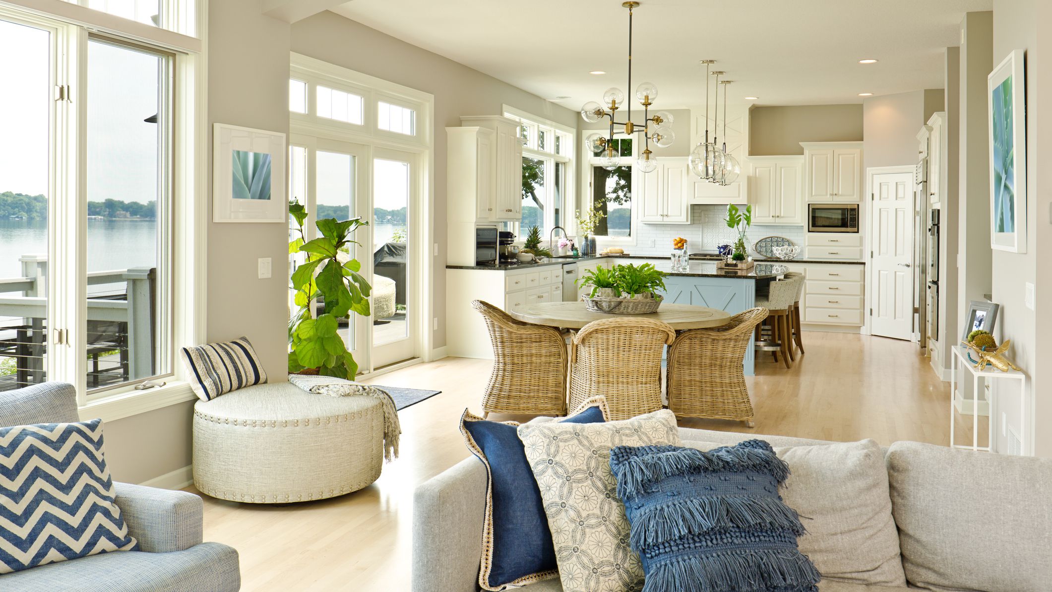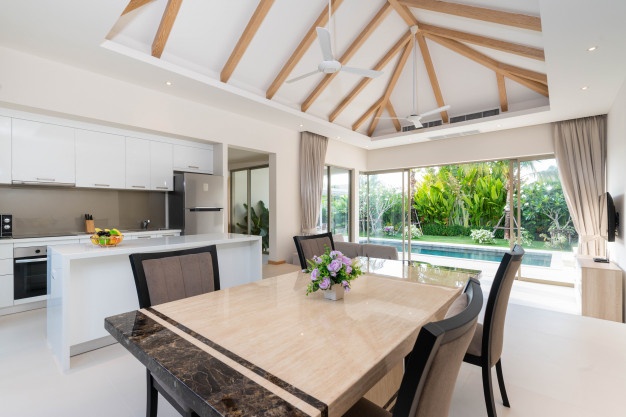 Ánh sáng và gió thường được tận dụng tối đa từ những khung cửa lớn, bố trí ít vách ngăn tạo sự liền mạch trong không gian.