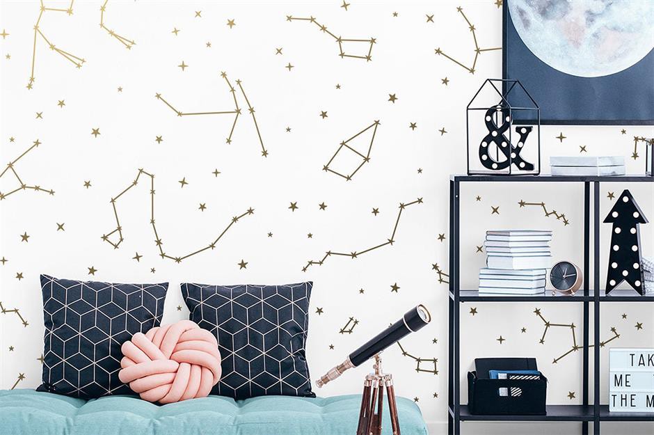 Bức tường với họa tiết vũ trụ gồm mặt trăng, chòm sao…sẽ mang đến cảm giác mới lạ và độc đáo cho ngôi nhà.