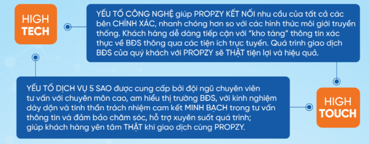 PROPZY kết hợp giữa “High Tech” (yếu tố công nghệ) với “High Touch” ( yếu tố con người, dịch vụ chuyên nghiệp 5 sao) vào BĐS.